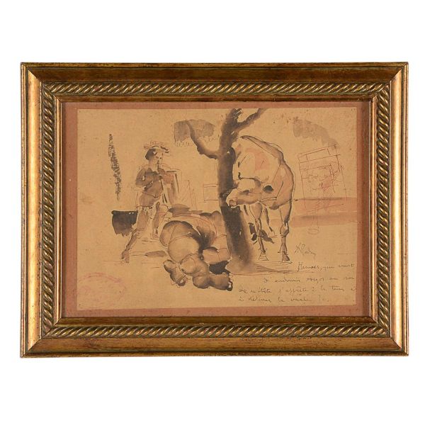 • <b>AUGUSTE RODIN</b><Br>(1840-1917)<Br>Escola Francesa<Br>Cena Mitológica<Br>Técnica mista s/ papel<Br>Ass. e titulado, na lateral direita<Br>17,5 x 25 cm