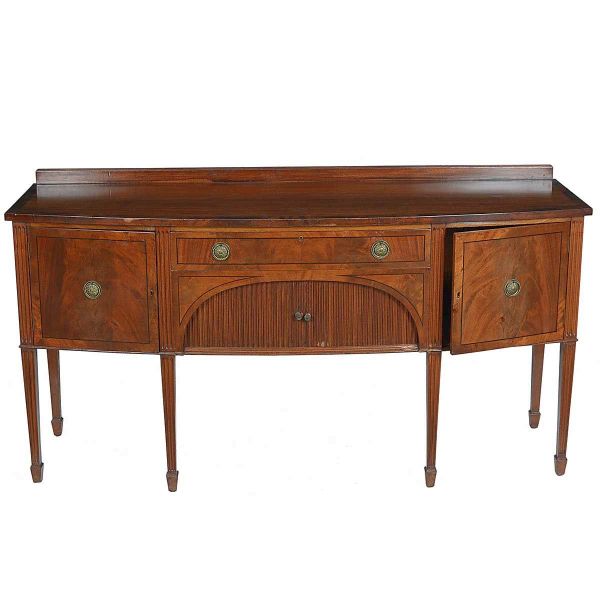 • "<b>Sideboard</b>" inglês vitoriano construído em mogno. Caixa retangular levemente abaulada à frente apresentando duas portas laterais centralizando gavetão e armário com portas em esteirinha. Pernas retilíneas levemente afiladas e frisos em baixo relevo. Ferragens de época modeladas em rosetas e perolados. Séc. XIX. Med. 92 x 184 x 63 cm