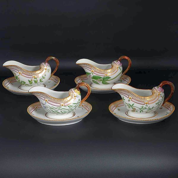 • <b>Conjunto de 4 molheiras</b>, "sauce boats", com bases em porcelana dinamarquesa da importante manufatura Royal Copenhagen modelo "Flora Danica". Cada peça, inteiramente pintada à mão em belíssima policromia com suas designações botânicas e numeração no verso. Apresentam bordas em mínimos picotados cobertos a folha de ouro. Compr. 23 cm
