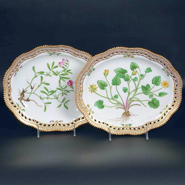 • <b>Par de travessas </b>ovais com bordas reticuladas em porcelana dinamarquesa da importante manufatura Royal Copenhagen modelo "Flora Danica". Cada peça, inteiramente pintada à mão em belíssima policromia com suas designações botânicas e numeração no verso. Apresenta borda em mínimos picotados cobertos a folha de ouro. Med. 27 x 22,5 cm