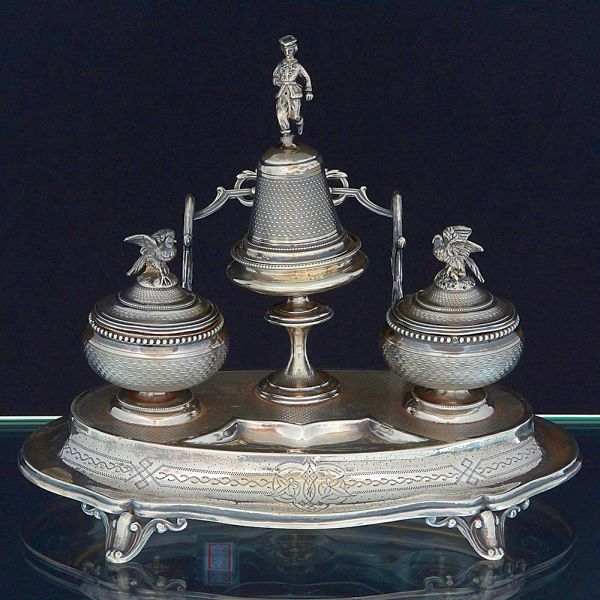 • <b>Tinteiro </b>em prata francesa do séc. XIX. Bandeja com trabalhos guilhochados. Recipiente para escrita encimado por aves e sineta ao centro com pega em figura de oficial (necessita solda). Parte posterior com suporte para pena monogramado ao centro. Contraste "Cabeça de Mercúrio" usado de 1840 a 1879. Compr. 29,5 cm. Peso 490 gramas.