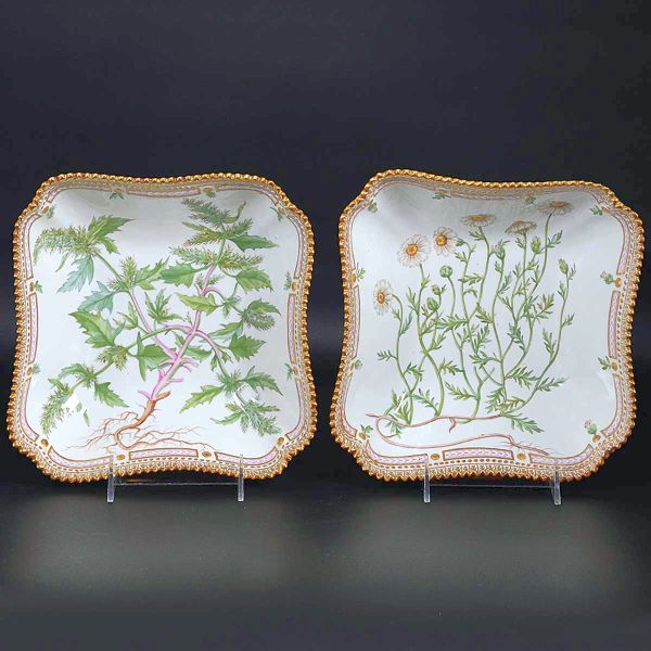 • <b>Par de "bowls" </b>quadrados em porcelana dinamarquesa da importante manufatura Royal Copenhagen modelo "Flora Danica". Cada peça, inteiramente pintada à mão em belíssima policromia com suas designações botânicas e numeração no verso. Apresenta borda em mínimos picotados cobertos a folha de ouro. Med. 23 x 23 cm