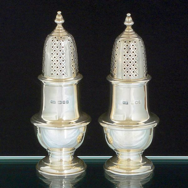 • <b>Par de polvilhadores </b>em forma balaústre lisa, em prata inglesa, com bases circulares e pega das tampas modeladas em pinha. Contraste da cidade de Londres de 1961 e marca do prateiro MAPPIN & WEBB. Alt. 16,5 cm. Peso 435 gramas.