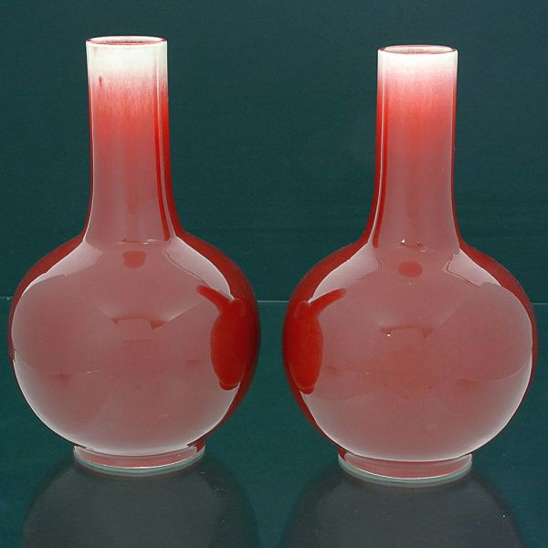 • <b>Par de vasos </b>bojudos de gargalos longos e cilíndricos em porcelana chinesa decorada em esmalte sangue de boi. Ideograma no fundo. Acompanham bases em madeira. Alt. sem as bases 29 cm