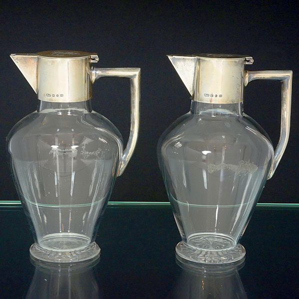 • <b>Par de jarras </b>bojudas em cristal inglês liso com montagem em prata vitoriana. Tampa monogramada e base estrelada. Contraste da cidade de Birmingham de 1890 e marca do prateiro H&P.