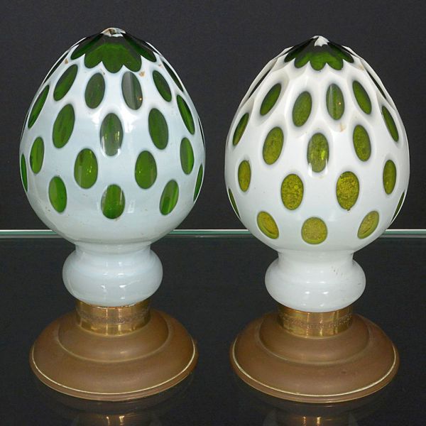 • <b>"Pendant" de pinhas </b>em cristal, ornamentadas em "overlay" verde, com elementos ovais revelando a camada interna colorida. Bases em metal dourado em formato de pedestal. Alt. 19 cm