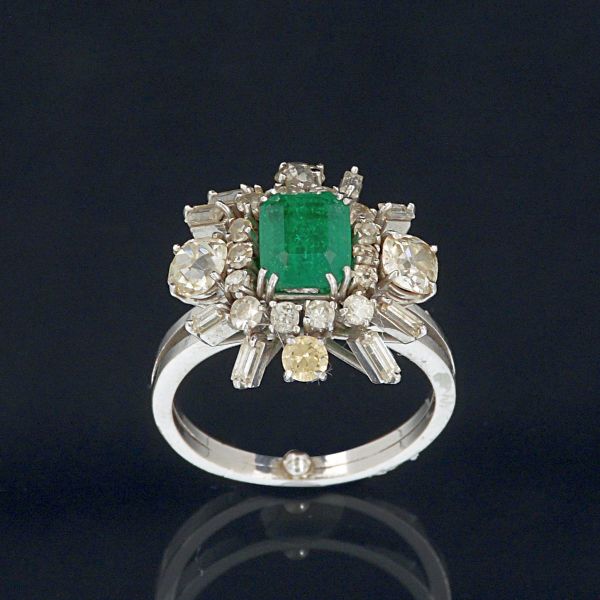 • <b>Anel </b>de esmeralda retangular com diamantes Brasil e lapidação "full brillant cut". Peso aproximado da esmeralda 1,50 ct. Peso aproximado dos diamantes 2 ct. Montado em platina.