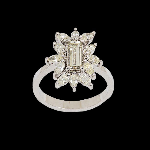 • <b>Anel </b>de ouro branco 18k com um diamante no centro de 0,92 ct aproximado de lapidação "baguette" e 12 diamantes com peso aproximado de 1,20 ct. Peso da peça 4 gramas.