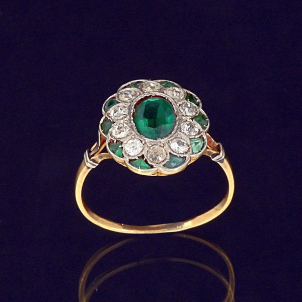 • <b>Anel </b>de esmeraldas e diamantes em ouro 18k, esmeraldas trillion pequenas e oval no centro. Peso da peça 3,87 gramas.