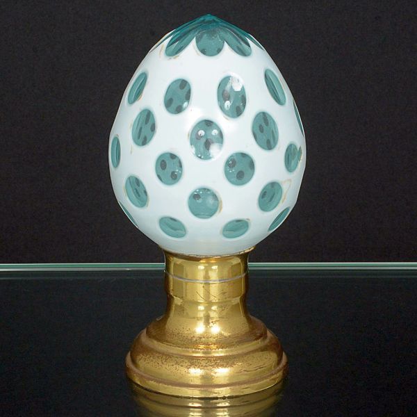 • <b>Pinha </b>na cor água marinha com "overlay" em branco leitoso. Base em metal. Alt. 18,5 cm