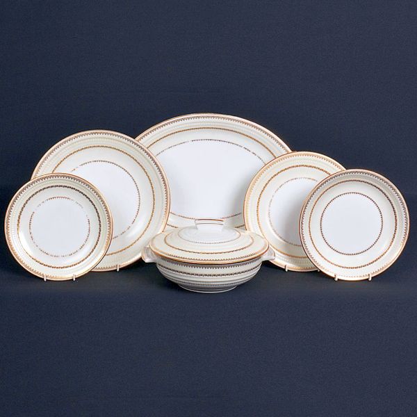 • <b>Serviço de jantar </b>em porcelana francesa de Limoges, nas cores creme e branco, com arabescos filetados ouro. Marca da manufatura no verso. Constando de 31 pratos rasos (25 cm), 12 pratos fundos (23 cm), 10 pratos para sobremesa (21,5 cm), 2 sopeiras (30 cm e 28 cm), 1 molheira (17 cm), 3 travessas ovais (42 cm, 36 cm e 24 cm), 2 travessas redondas (32 cm e 29 cm), 1 saladeira funda (29 cm), 1 "bowl" (25 cm) e 3 fruteiras com pés. Total de 66 peças.