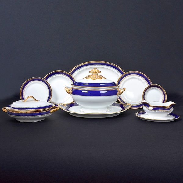 • <b>Serviço de jantar </b>em porcelana portuguesa Vista Alegre, com fundo branco e bordas decoradas em azul cobalto e ouro. Marca da manufatura no verso. Constando de 19 pratos rasos, 12 pratos fundos, 9 pratos de sobremesa, 11 pratos de pão, 1 terrina c/ "presentoir", 1 legumeira c/ tampa, 5 travessas de vários tamanhos e 1 molheira. Total de 59 peças. Med. da travessa maior 38 cm; Med. da travessa menor 27 cm