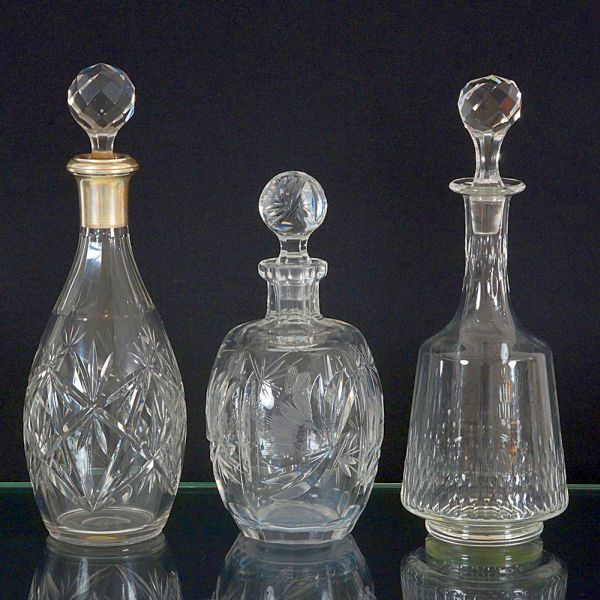 • <b>Conjunto de três garrafas </b>em cristal com lapidações diversas. Composto por garrafa de corpo facetado com tampa piramidal, outra com detalhes lapidados e friso superior em metal dourado e a terceira com lapidação geométrica em corpo octogonal com tampa facetada.