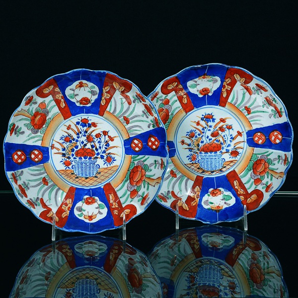 • <b>Par de pratos </b>em porcelana japonesa Imari. Apresentam borda em ondulações e policromia característica com cesto de flores e reservas com flores e folhas. Séc. XIX / XX. Diâm. 22 cm