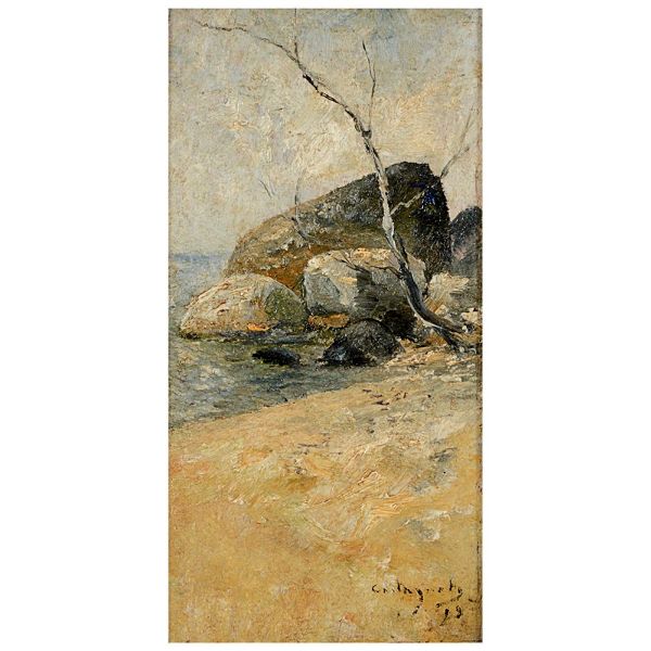 • <b>CASTAGNETO, GIOVANNI BATTISTA</b><BR>(1851-1900)<BR>Recanto de Praia<BR>Óleo s/ madeira<BR>Ass. e datado 1899, cid<BR>Apresenta no verso, selo do Museu Nacional de Belas Artes<BR>21,5 x 11 cm
