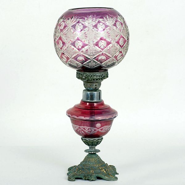 • Antiga <b>lamparina </b>adaptada para "abatjour", apresentando candeeiro e cúpula em cristal na cor uva com lapidados geometrizados translúcidos. Montagem em bronze. Alt. 42,5 cm