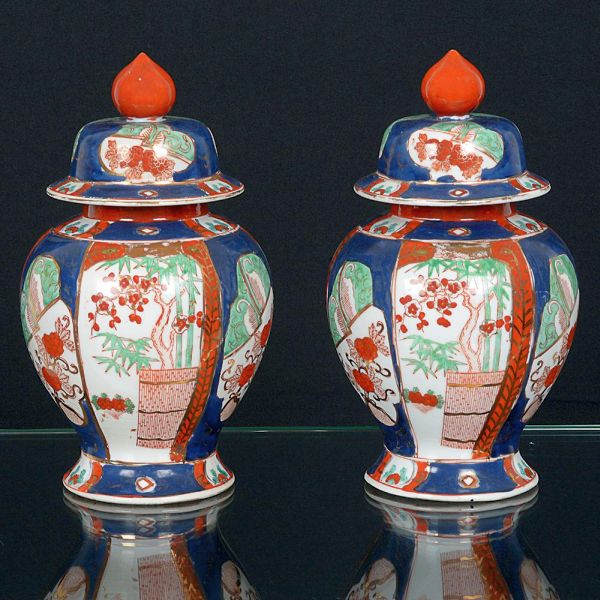 • Antigo <b>par de vasos </b>bojudos em porcelana japonesa Imari decorados em suas tonalidades características com elementos vegetais e arabescos realçados a ouro. Alt. 26,5 cm