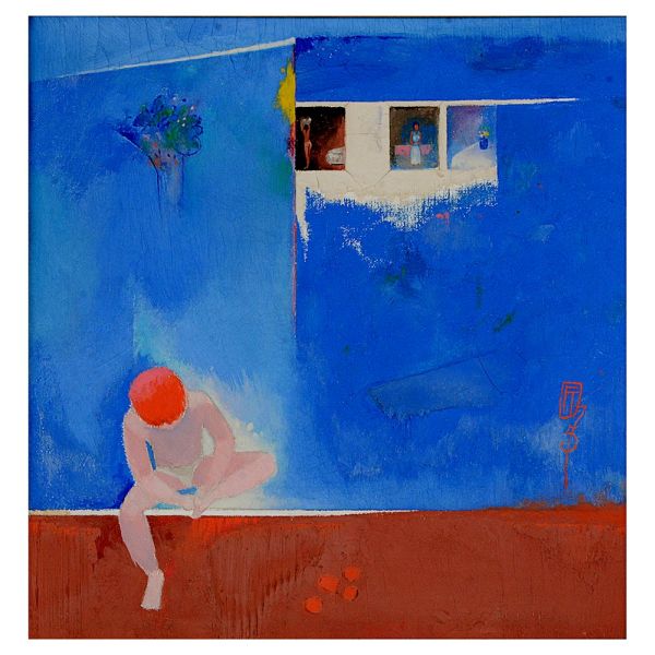 • <b>FLORIANO TEIXEIRA</b><br>(1923-2000)<br>Mulher Sentada<br>Óleo s/ tela<br>Ass. e datado 75, na lateral direita<br>Ass., situado e datado Salvador 1975, no verso<br>25,5 x 25,5 cm