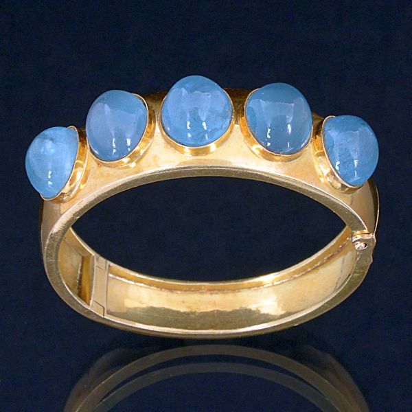• <b>Pulseira </b>de águas-marinhas montada em ouro 18k. Águas-marinhas de formato oval, lapidação em cabouchan de cor intensa azul com o peso aproximado de 60.00 quilates. Peso total da peça 59.90 gramas
