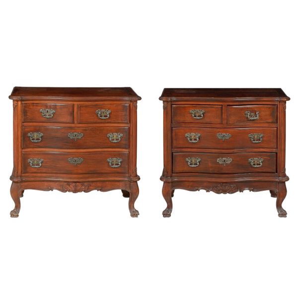 • <b>Par de cômodas</b>  brasileiras em madeira nobre apresentando caixa retangular com frente movimentada. Tampo de cantos anteriores arredondados e frisados sobre duas gavetas dispostas lado a lado e outras duas gavetas de maior dimensão. Discretos entalhes em volutas e pés revirados terminados em sapatas. Ferragens em bronze de época. Séc. XIX.