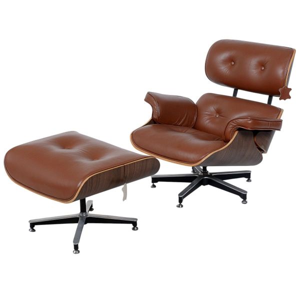 • <b>Eames Lounge Chair & Ottoman </b>- Conjunto composto por poltrona e banqueta em madeira curvada e estrutura giratória em metal preto com sapatas reguláveis. Almofadado clássico em couro marrom com botões, seguindo o icônico "design" criado por Charles & Ray Eames.