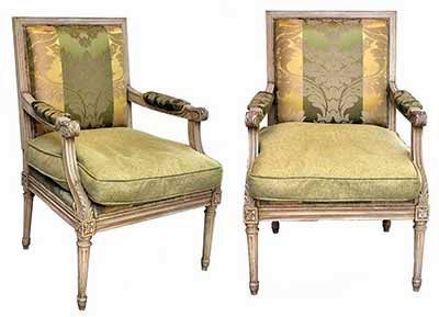 • <b>Par de cadeiras de braços </b>francesas, no estilo Louis XVI. Estrutura em madeira patinada em bege e entalhada com volutas e rosetas. Pernas retilíneas com escavados verticais. MAISON JANSEN - Paris. Med. 94 x 64 x 65 cm