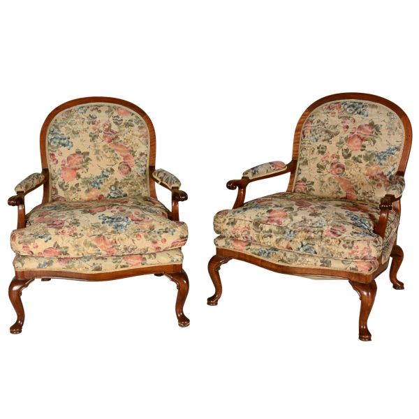 • Antigo <b>par de cadeiras de braços </b>inglesas, com assento avantajado e estrutura em mogno. Braços sinuosos terminados em enrolados e pernas recurvadas terminadas em sapatas. Belo estofamento em tecido decorado com frutos.