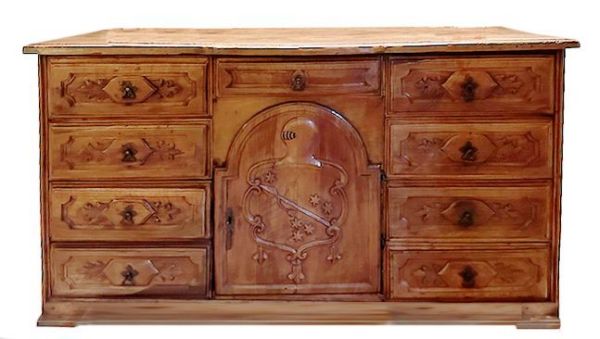 • <b>Arcaz </b>europeu, apresentando caixa retangular e várias gavetas almofadadas decoradas com volutas centralizando armário decorado com escudo armorial. Ferragens de época. Séc. XIX. Med. 100 x 182 x 80 cm