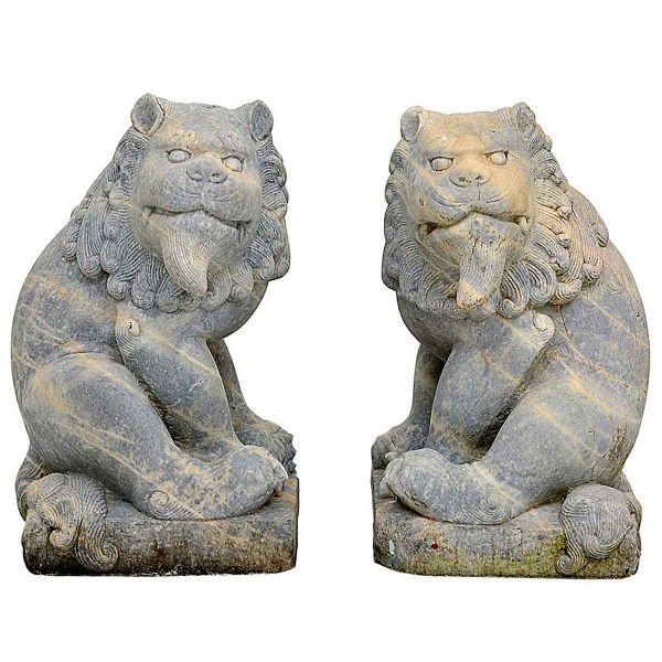 • <b>Par de antigos dragões </b>chineses esculpidos em pó de mármore. Uma perna de um deles com rachado. Séc. XIX. Alt. 41 cm