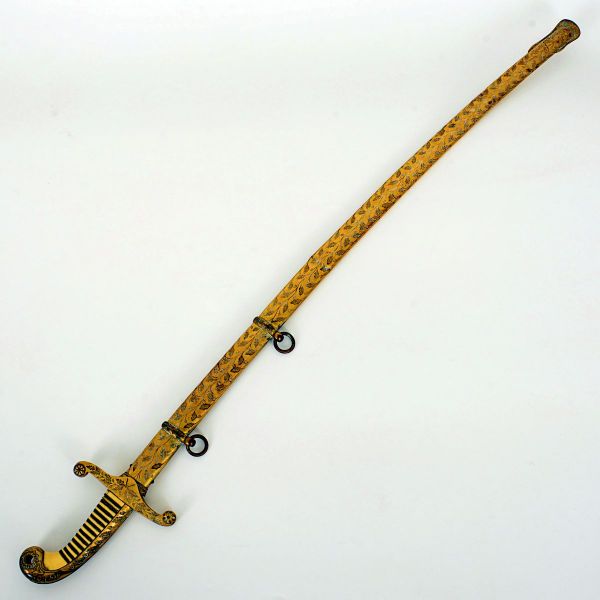 • <b>Espada </b>com bainha, ricamente trabalhada em metal dourado, com cabo, guarda e bainha ornamentados por motivos florais em relevo. Lâmina curva com damasquinagem em ouro, apresentando figuras e arabescos ao longo de toda a extensão. Desgastes naturais do tempo.