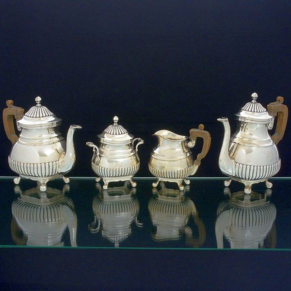 • <b>Serviço para chá e café </b>em prata portuguesa decorada com gomos na base e tampa. Pés revirados, pega da tampa modelada em pinha e alças dos bules e leiteira em madeira. Contraste da cidade do Porto 916 ml usado a partir de 1938, 1º Título. Monogramado EJ. Constando de bule para café, bule para chá, leiteira e açucareiro. Alt. do bule maior 23 cm. Peso 3000 gramas.