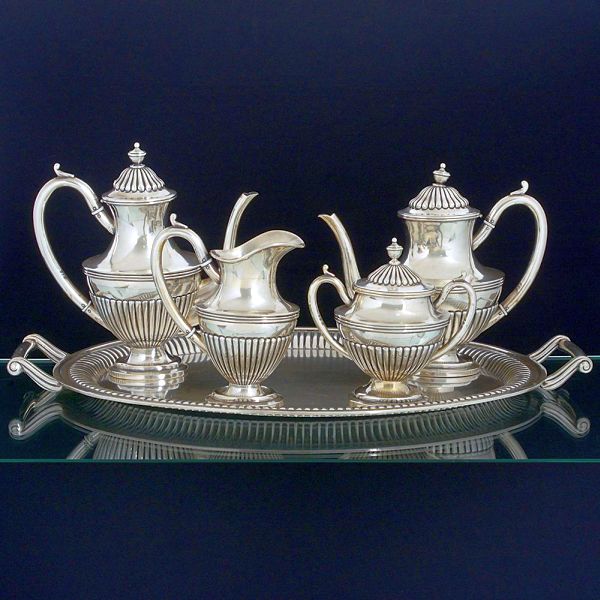• <b>Serviço para chá e café </b>em prata portuguesa decorada em gomos, alças recurvadas e pegas modeladas em pinhas. Isoladores em marfim. Contraste da cidade de Lisboa usado a partir de 1938. Constando de bandeja, bules para chá e café, leiteira e açucareiro. Compr. da bandeja 66 cm; Alt. do bule de café 27 cm. Peso 5400 gramas.