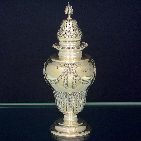 • <b>Polvilhador </b>de formato balaústre em prata inglesa vitoriana decorada com guirlandas e laços. Reserva oval lisa na face anterior e parte inferior com folhas de palmas e goivos. Contraste da cidade de Londres de 1898 e vestígio de marca do prateiro CHARLES STUART HARRIS. Alt. 19,5 cm. Peso 250 gramas.