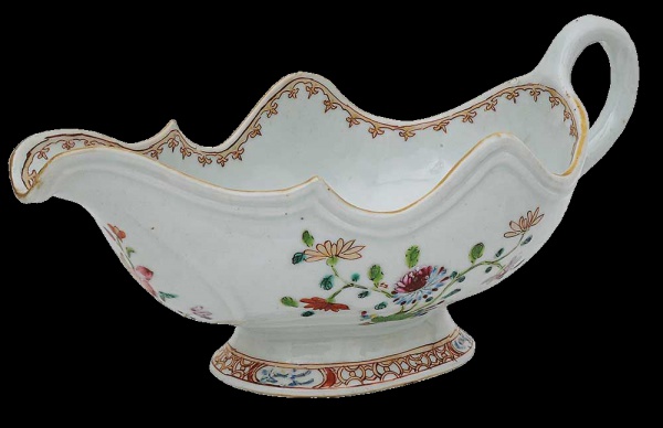 • <B>Molheira </B>navicular em porcelana Companhia da Índias, pertencente ao "Serviço dos Pavões". Borda movimentada e decoração em policromia Família Rosa, apresentando dois pavões apoiados em rochedos cercados de peônias. Alça recurvada, borda e base em arabescos. Séc. XVIII. Compr. 23,5 cm
