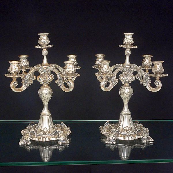 • <b>Par de candelabros </b>em prata 833 ml, para cinco velas, e profusa decoração com elementos característicos do estilo D. João V com braços em curva e contracurva sustentando os receptáculos recamados por folhas. Bases quadradas. Marca do prateiro CORREA. Alt. 35 cm. Peso 4125 gramas.