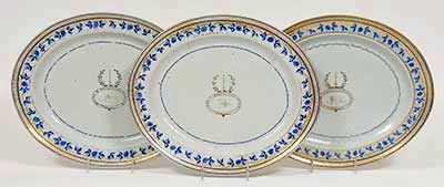 • <b>Conjunto de três travessas </b>de forma oval, em porcelana Companhia das Índias, período Jiaqing, tendo ao centro "crest" monogramado, perolados e bordas com cachos de uvas e folhas de parreira em azul índigo realçados a ouro. Início do séc. XIX. Med. 40,5 x 34 cm