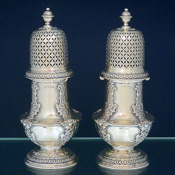 • <b>Par de polvilhadores </b>em prata inglesa decorada em estilo fitomórfico e cabeças de anjos. Bases e borda da tampa peroladas e pega em forma de pinha. Contraste da cidade de Londres de 1900 e marca do prateiro JOSHUA VANDER. Alt. 24 cm. Peso 1135 cm.