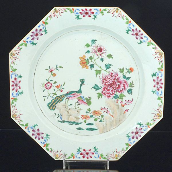 • <B>Medalhão </B>de forma oitavada em porcelana Companhia das Índias, Família Rosa, pertencente ao "Serviço Real de D. João VI", conhecido como "Serviço dos Pavões". Séc. XVIII. Diâm. 33 cm