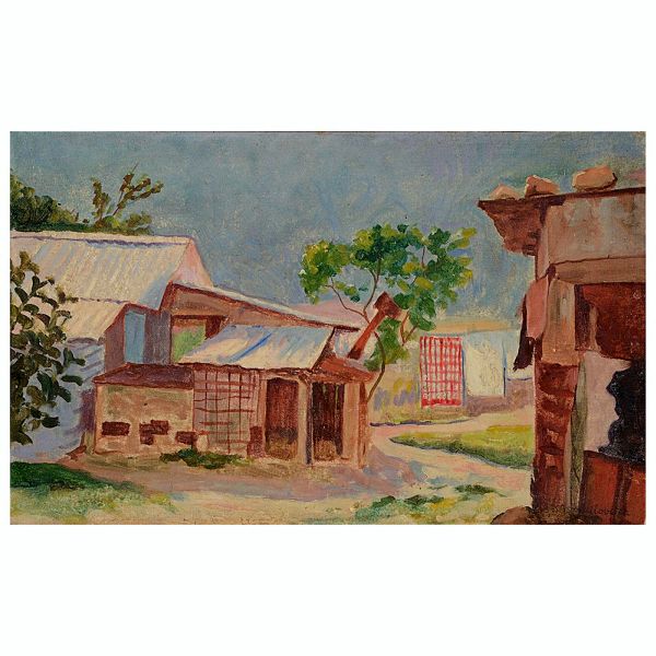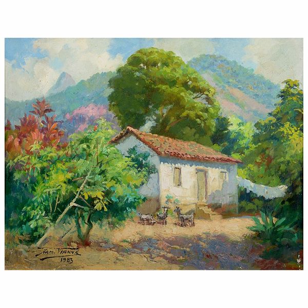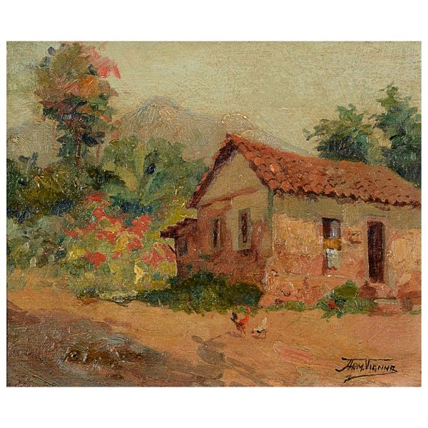 • <b>ARMANDO VIANNA</b><BR>(1897-1991)<BR>Casa da Roça<BR>Óleo s/ madeira<BR>Ass. cid<BR>Ass., titulado, situado e datado E. do Rio 1955, no verso<BR>22 x 26 cm