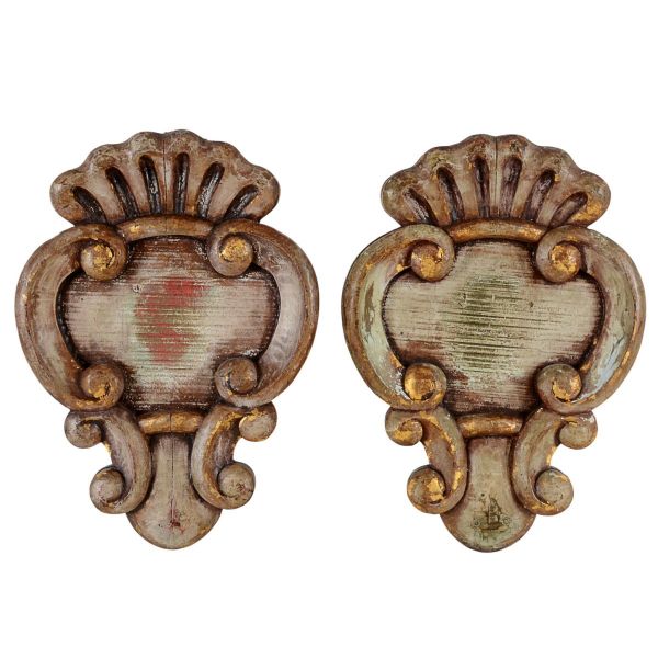 • <B>Par de talhas </B>de parede em madeira patinada com vestígios de ouro e entalhes de motivos barrocos. Séc. XIX. Med. 54 x 39 cm