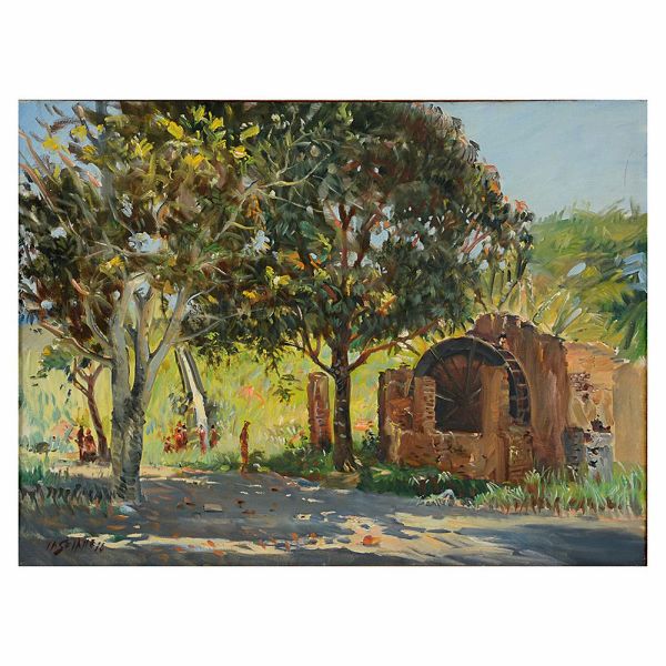 • <B>DIMITRI ISMAILOVITCH</B><BR>(1890-1976)<BR>Paisagem<BR>Óleo s/ tela colada em cartão<BR>Ass. cid<BR>25 x 41 cm