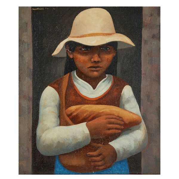 • <B>MÁRIO MOLLARI</B><BR>(1930-2010)<BR>Camponês com Pão<BR>Óleo s/ juta<BR>Ass. cse<BR>70 x 60 cm
