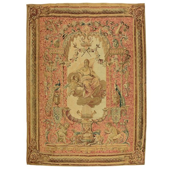 • <b>Tapeçaria </b>francesa representando alegoria com musa da antiguidade clássica cercada por "puttis" e edificação com aves. Séc. XIX. Med. 240 x 175 cm