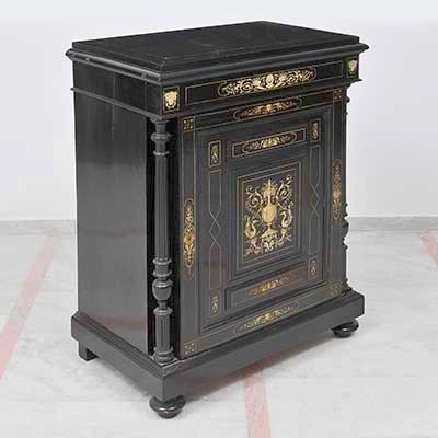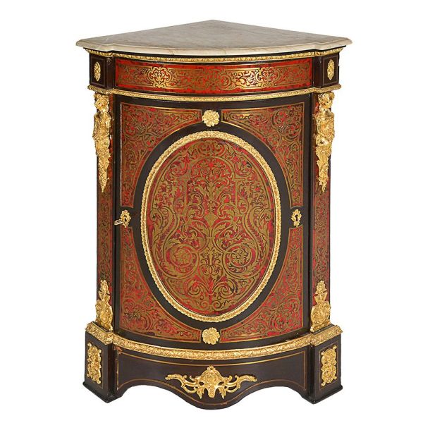 • Belo <b>dunquerque de canto</b>, francês, construído em madeira ebanizada com placagens em tartaruga loura sob aplicações metálicas, ao gosto de André Charles Boulle. Apresenta porta anterior abaulada com uma prateleira interna. Riquíssimos adornos em bronze ormolu destacando duas elaboradas cariátides femininas com "bouquets" de flores e guirlandas. Tampo em mármore rajado com frente boleada. Séc. XVIII ou início XIX. Med. 107 x 53 x 77 cm