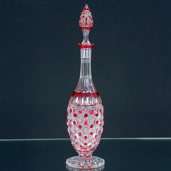 • <b>Visconde de Jaguary - Garrafa </b>em cristal, com camada externa em tom rubi "overlay", ricamente lapidado com motivos geométricos e aberturas facetadas que revelam o interior translúcido, pertencente ao serviço do referido nobre. Tampa original acompanhando o estilo. Reproduzido das págs. 200 à 203 do livro "O Cristal no Império do Brasil", por Jorge Getúlio Veiga.