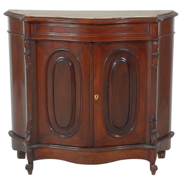 • Antigo <b>dunquerque </b>em madeira nobre apresentando frente e laterais movimentadas. Tampo em mármore Carrara embutido, Gavetão no alto sobre 2 portas rebatíveis decoradas com almofadas ovoides. Ilhargas com discreto entalhe vegetalista e pés enrolados para fora. Espelho da fechadura em material córneo. Séc. XIX. Med.