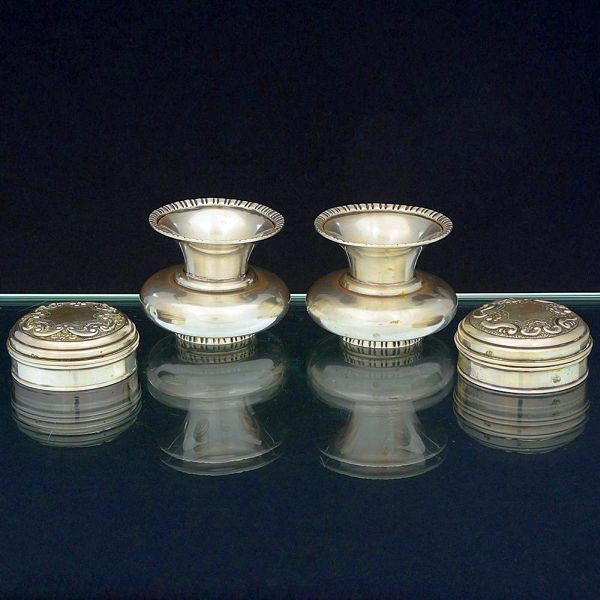 • <b>Lote em prata </b>portuguesa "Águia", teor 833 ml, constando de par de pequenas caixas circulares com tampas cinzeladas com arabescos e par de mini jarras com parte inferior bojuda e bocal de corneta. Diâm. das caixinhas 6 cm; Alt. dos vasinhos 6 cm. Peso 295 gramas.