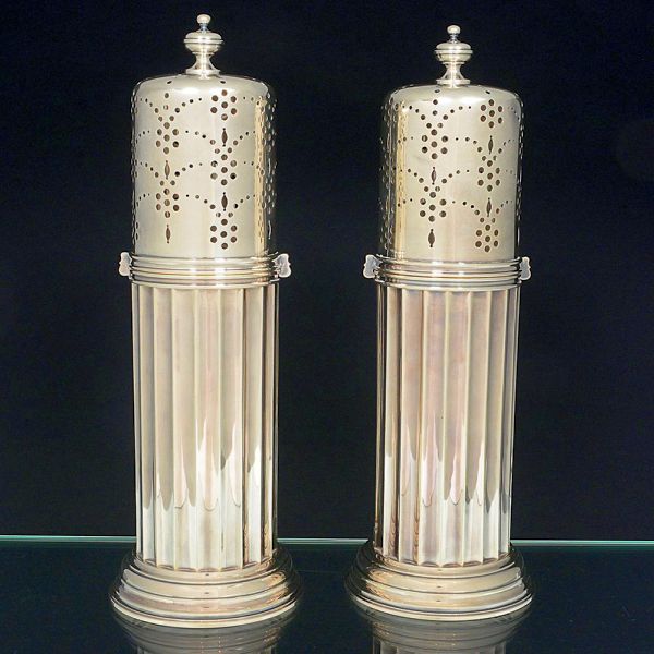 • <b>Par de grandes polvilhadores </b>em prata inglesa decorada em gomos escavados e base circular frisada. Pega da tampa em forma de pinha. Contraste da cidade de Londres de 1978 e marca do prateiro CGV Ltda. Alt. 37,5 cm. Peso 2590 gramas.