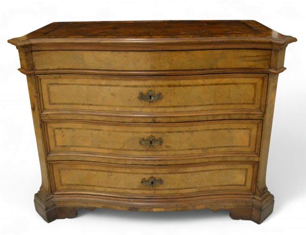 • Robusta e bela <b>cômoda </b>italiana em raiz de nogueira. Caixa retangular retilínea com quinas anteriores projetadas e frente movimentada. Quatro gavetões e decoração em filetados. Ferragens em bronze. Séc. XIX. Med. 107 x 145 x 69 cm
