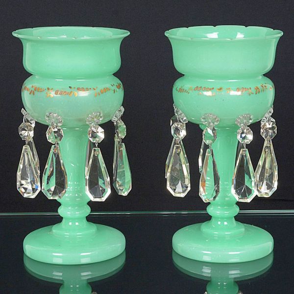 • <b>Par de vasos </b>de corpo bojudo, em vidro opalinado na cor verde e haste torneada. Apresentam aplicação de rosetas em vidro translúcido ao redor da parte superior, além de friso decorativo em douração. Alt. 31 cm